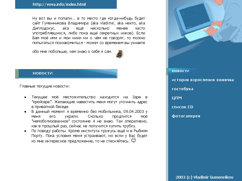 Вот и всё, конец версии 1.0 сайта :) Всё остальное анде констракшен. В связи с некоторыми событиями в личной жизни, у меня сейчас не то настроение, что бы заниматься сайтом, так что в таком состоянии он может долго пробыть. Всё же его основная цель - не донести информацию о себе всему миру, не поразить окружающих своим талантом в вебдизайне (сразу говорю - подобным талантом не страдаю), а всего лишь заиметь постоянный адрес в инете, с помощью которого мои близкие и дальние знакомые всегда смогут меня отыскать и узнать как у меня дела.